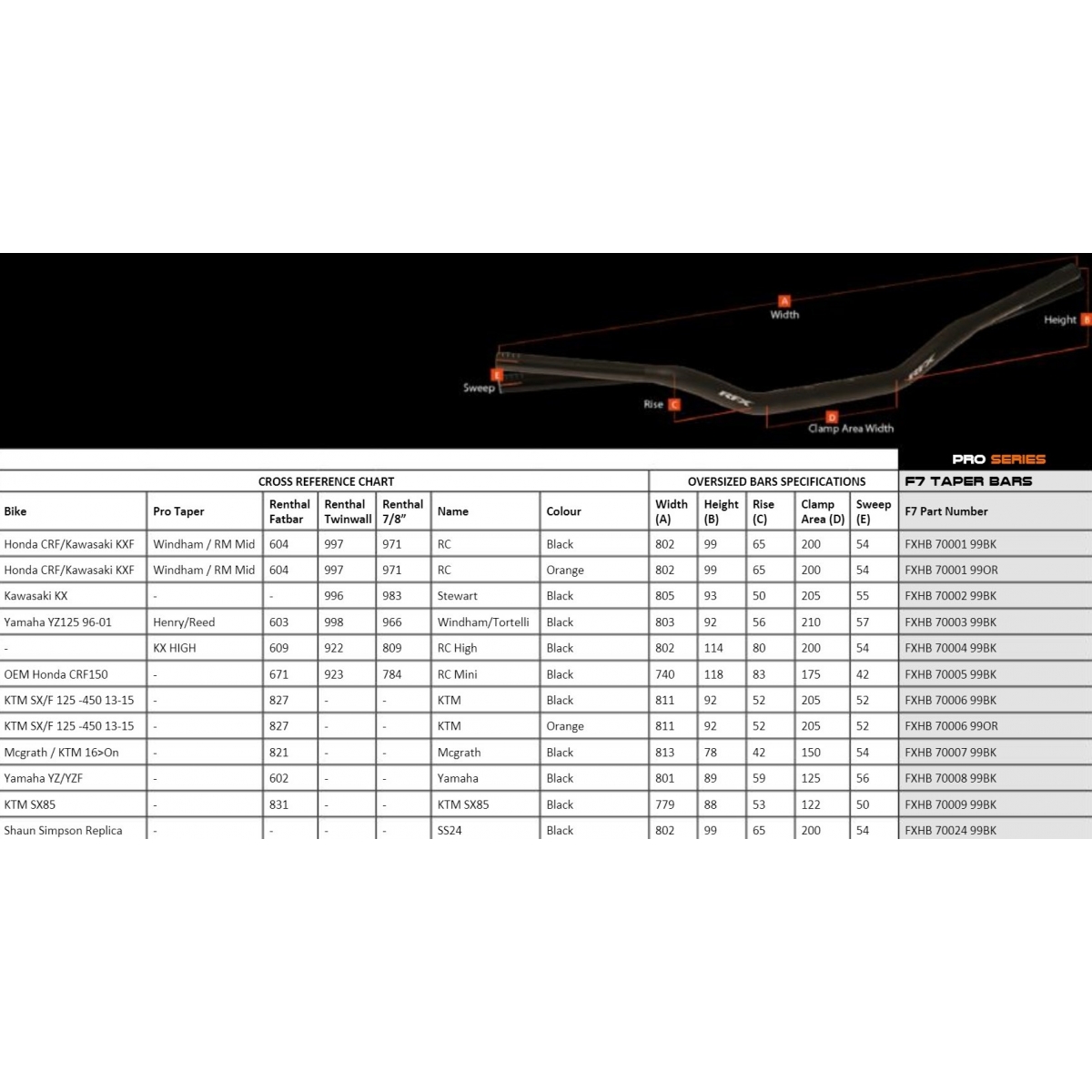 Kierownice F7 Taper są wykonane z aluminium 7075-T6 i mają przedłużenie Oversize Taper Extension (OTE), aby zapewnić najwyższą wytrzymałość i odporność na uderzenia, podczas gdy technologia Engineered Flex Technology (EFT) i Progressive Damping Control (PDC) zapewniają odpowiednią elastyczność zmniejsza wibracje motocykla, aby pomóc w walce ze zmęczeniem zawodnika.
