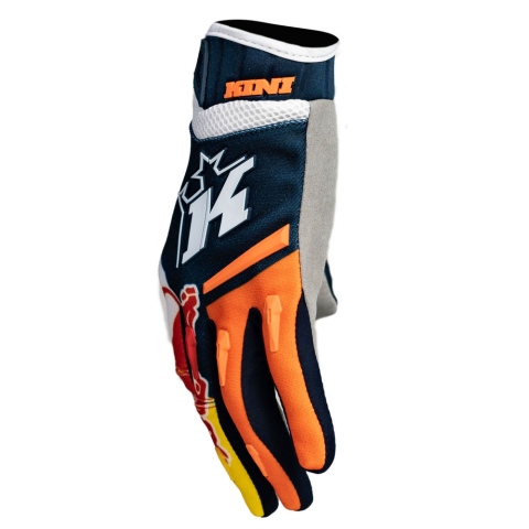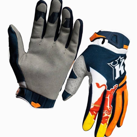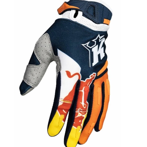 With our highly functional Kini Red Bull Competition Gloves in the stylish colors orange/white/night sky you get a high-quality motocross glove that fits your hands perfectly. The palms made of synthetic leather with thumb reinforcement offer you maximum grip on the handlebar. The silicone print for better grip when braking ensures that you always keep control on the track. Due to the pre-shaped fit, with slightly curved fingers the gloves sit optimally on your hands and thus guarantee an efficient power transmission to the handlebar. With the Velcro wrist closure, an individual and quick adjustment to any hand size is guaranteed. The outer material of these gloves is made of 60% nylon, 20% polyester, 3% neoprene and 17% polyurethane.