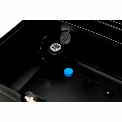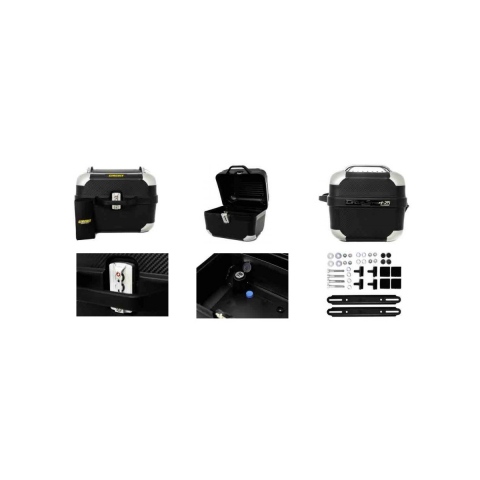 Kufer centralny włoskiego designu o pojemności 28L. Kufer górny wyposażony jest w system antywibracyjny, aluminiowy zamek szyfrowy oraz wewnętrzny port USB do ładowania telefonu komórkowego lub tabletu.