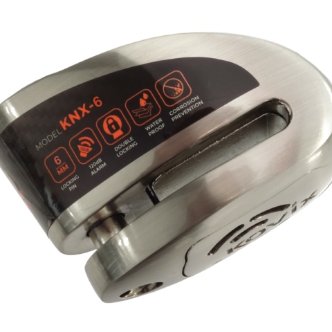 Blokada tarczy hamulcowej z wbudowanych alarmem o natężeniu dźwięku 120 dB z możliwością ustawiania opcji syreny ON/OFF. Zamek ze stali nierdzewnej i wodoodporne podzespoły elektryczne gwarantują ochronę przed korozją i niezawodność w każdych warunkach atmosferycznych. Blokada wyposażona jest w długo pracującą i przyjazną dla środowiska litową baterię. Zabezpieczenie blokuje koło bolcem o średnicy 6 mm, przez co uniemożliwia jazdę i ruch motocykla lub skutera.