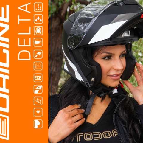 Kask motocyklowy Origine Delta sprawia, że każda podróż jest w pełni komfortowa i przyjemna. Ze wszystkimi najlepszymi cechami kasku Delta pozwala oddać się czystej przyjemności z jazdy, bez zbędnych gadżetów. To wszystko za sprawą podnoszonej szczęki i blendy wysuwanej jednym ruchem ręki. Aby zminimalizować zjawisko parowania wizjera kask został wyposażony w deflektor natomiast szybka przygotowana jest pod założenie Pinlocka. Komfort podczas jazdy z zamkniętą szczęką w upalny dzień zapewniają trzy zintegrowane wloty powietrza, które można regulować. Mikrometryczne zapięcie pozwala w bardzo łatwy sposób odpiąć i zapiąć kask także w rękawiczkach motocyklowych. Aby utrzymać kask w czystości posiada całkowicie wyjmowane i przystosowane do prania wnętrze.