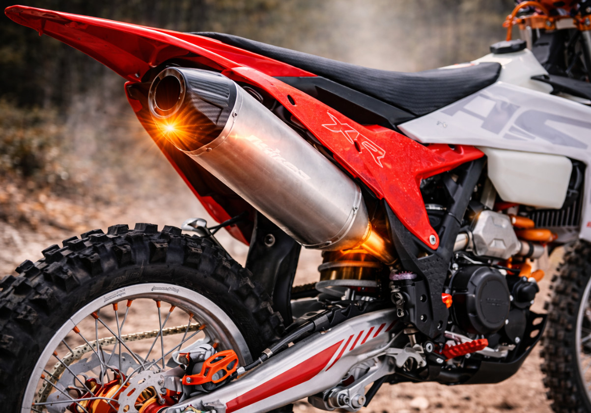 Końcówka wydechu wykonana ze stali nierdzewnej zapewnia wysoką odporność na temperaturę i warunki terenowe, co znacząco wydłuża żywotność układu. Dodatkowo nadaje motocyklowi surowy, sportowy wygląd, idealnie wpisujący się w charakter serii Racing.