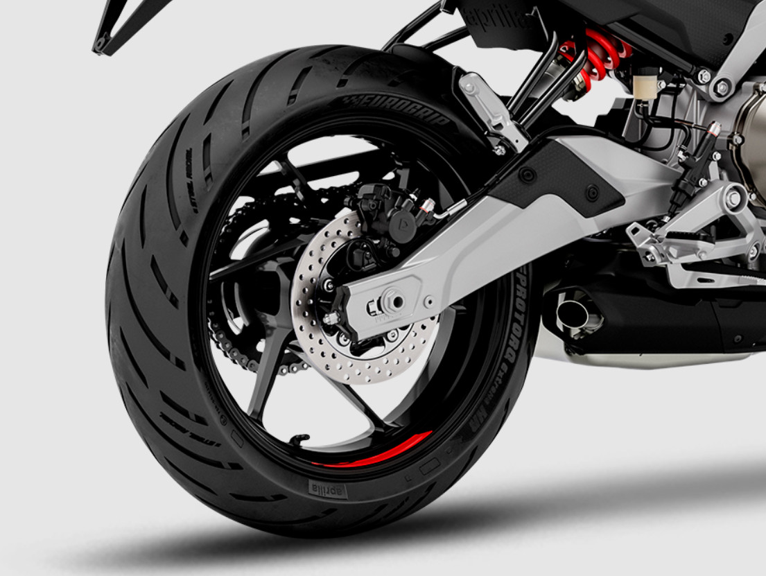 Aprilia Tuono 457 została wyposażona w 17-calowe obręcze kół, które współpracują z oponą 110/70 z przodu oraz 150/60 z tyłu. Taka konfiguracja zapewnia szybkie składanie się w zakręty, precyzyjne prowadzenie oraz stabilność przy wyższych prędkościach.