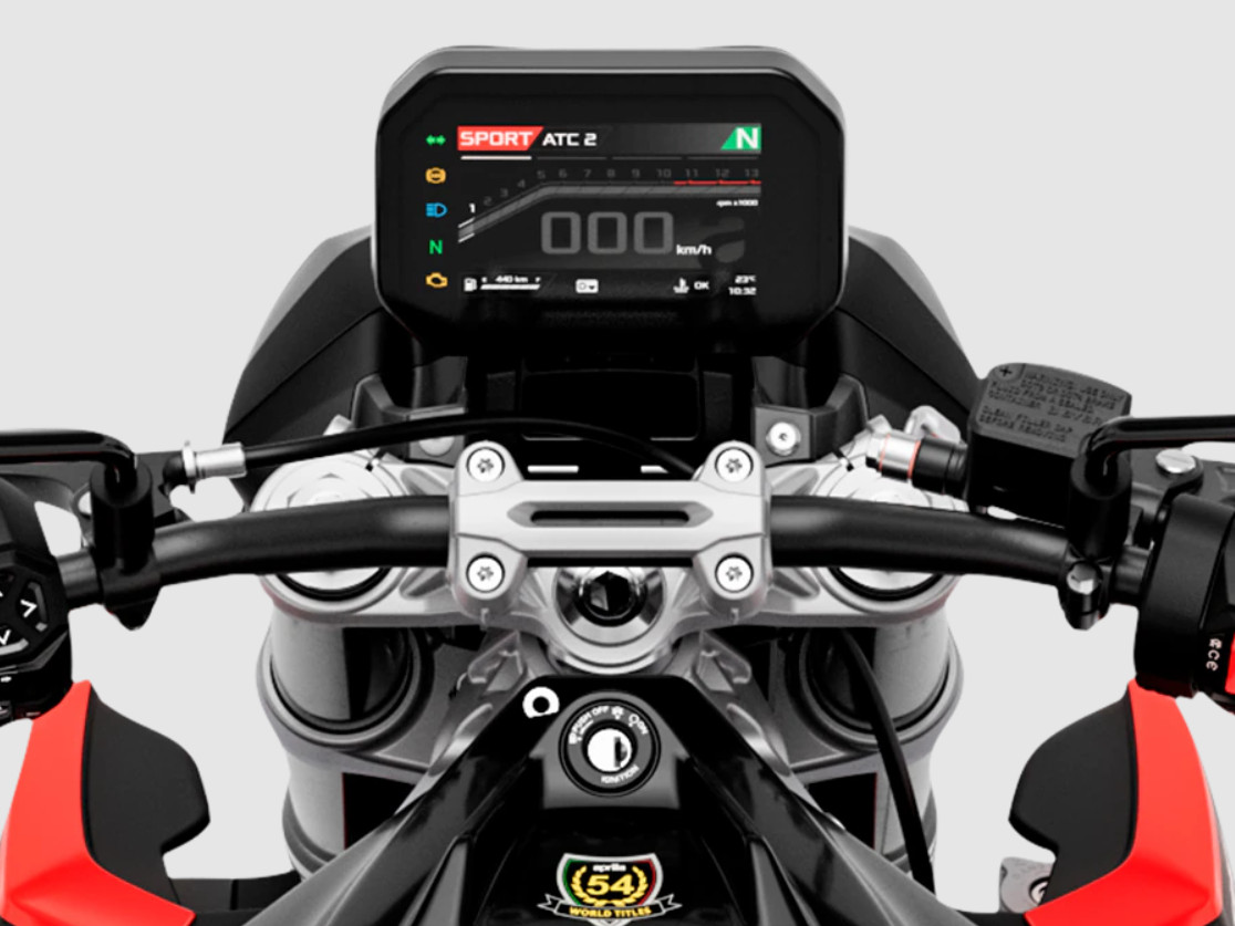 Aprilia Tuono 457 została wyposażona w 5-calowy, kolorowy wyświetlacz TFT z nowoczesnym i intuicyjnym interfejsem. Ekran zapewnia czytelny podgląd najważniejszych parametrów jazdy w każdych warunkach oświetleniowych. Podświetlane przełączniki na kierownicy ułatwiają obsługę funkcji motocykla, zwiększając ergonomię i bezpieczeństwo po zmroku.