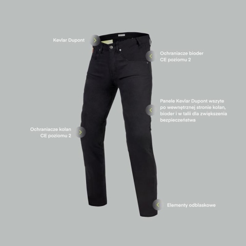 O Twoje bezpieczeństwo dbają: ochraniacze SAS-TEC® (biodra, kolana) oraz panele wykonane z wytrzymałego aramidu na kolanach, biodrach i w pasie. Ultracienkie ochraniacze SAS-TEC® pozwalają wygodnie użytkować spodnie na co dzień, np. po dojeździe do pracy, na uczelnię.