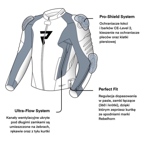 Za Twoje bezpieczeństwo odpowiadają ochraniacze poziomu 2 oraz odblaskowe elementy.