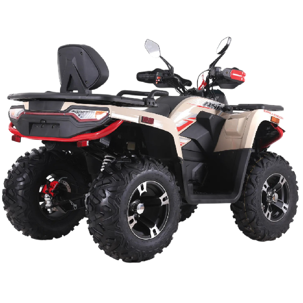 Pojazd posiada automatyczną skrzynię biegów z dwoma trybami jazdy do przodu: L (wolny) do pracy w trudnym terenie oraz H (szybki) do sprawniejszego przemieszczania się. Duża konstrukcja quada oparta jest na 12-calowych felgach aluminiowych, co przekłada się na stabilność i komfort jazdy.
