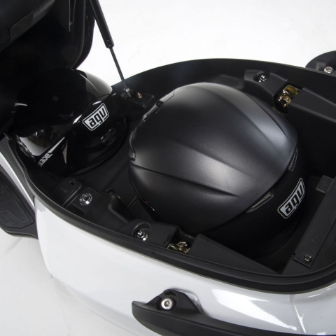 Skuter oferuje bardzo wygodną pozycję za kierownicą, ale także na miejscu dla pasażera. Nawet wyższe osoby nie będą narzekały na brak miejsca na nogi. Wysoka szyba z przodu ochroni kierowcę przed deszczem i naporem powietrza.