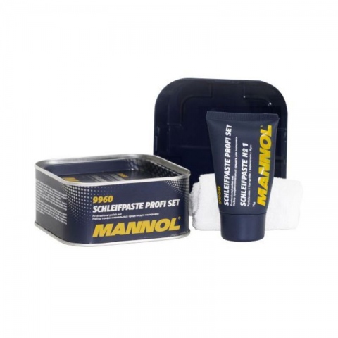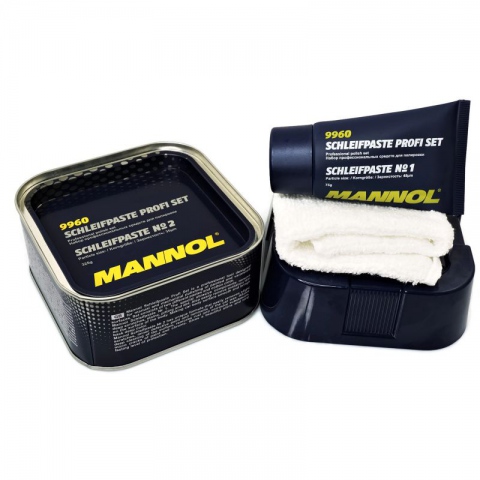 MANNOL Schleifpaste Profi Set – zestaw profesjonalnych substancji do ręcznego i mechanicznego czyszczenia lakierowanych i malowanych powierzchni. Pasty różnią się wielkością substancji ciernych. Schleifpaste MANNOL № 1 usuwa głębokie rysy, korozję i porysowane lakiery dzięki składnikom ściernym. Usuwa zwietrzałe i matowe warstwy farby. Schleifpaste MANNOL № 2 usuwa płytkie rysy, małe ubytki powłok lakierowanych i malowanych, przywraca blask. Łatwo usuwa pozostałości po lakierowaniu karoserii, umożliwia głębokie zabarwienie powierzchni, usuwa rdzę i żrące substancje z mikroszczelin farby i elementów chromowanych.