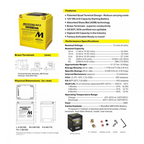 Motobatt produkowany w technologii AGM, jest gotowy do użycia bez konieczności zalewania i ładowania ,dzięki użyciu nowszych mat wykonanych z włókna szklanego, całkowicie absorbujących kwas i jest pełni naładowany.